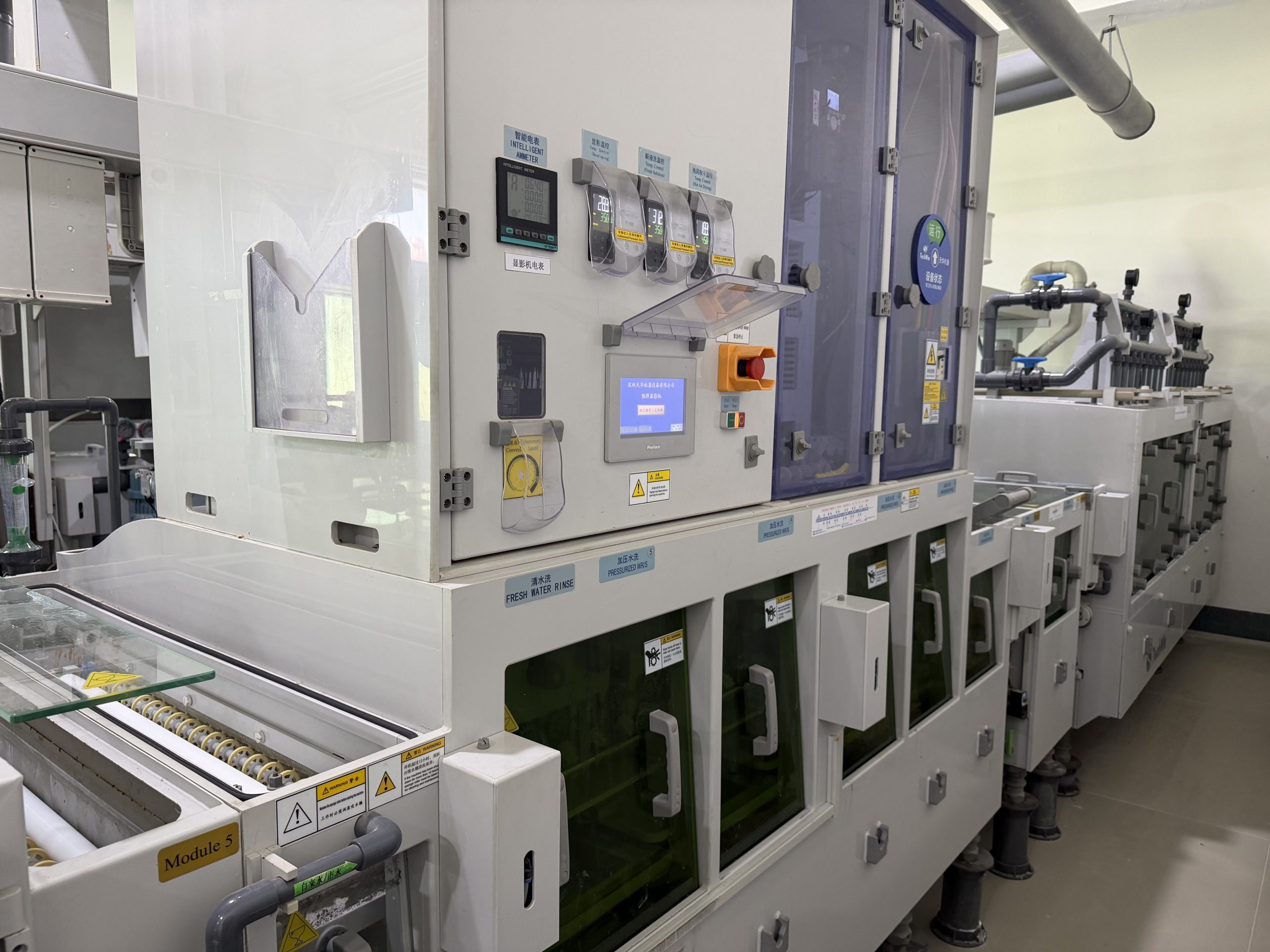 在 FPC(柔性印刷电路板)的阻焊制程中,阻焊显影线是衔接防焊曝光工序的核心自动化设备,核心功能是通过化学显影液的喷淋与清洗,精准去除 FPC 表面经曝光后未交联固化的阻焊材料,露出设计要求的焊盘区域,最终形成绝缘、耐蚀的阻焊保护图形。